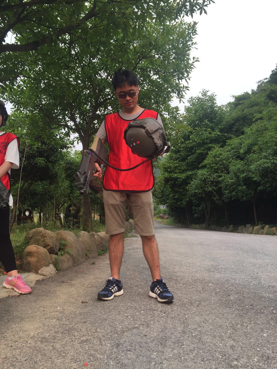 沿着照片上这条路一直走进去走到头就是一个农庄了,小和山真人CS基地就在这边,接下来,一个姓白的教官把我们集合,给我们发战服以及指导我们如何使用激光枪(话说可能天太热了,印象中的迷彩服变成了类似于救生衣一样的)