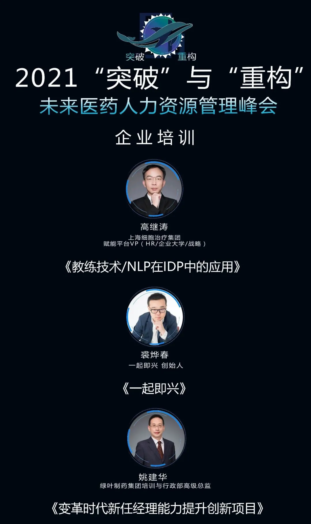 本次大会邀请了上海细胞治疗集团赋能平台VP高继涛先生、一起即兴创始人裘烨春先生、绿叶制药集团培训与行政部高级总监姚建华先生共同探讨新时代的企业培训都有哪些变化;将教练技术、NLP运用到个人发展计划中,明确发展路径;新时代下新任经理能力该如何提升才能更快适应工作。