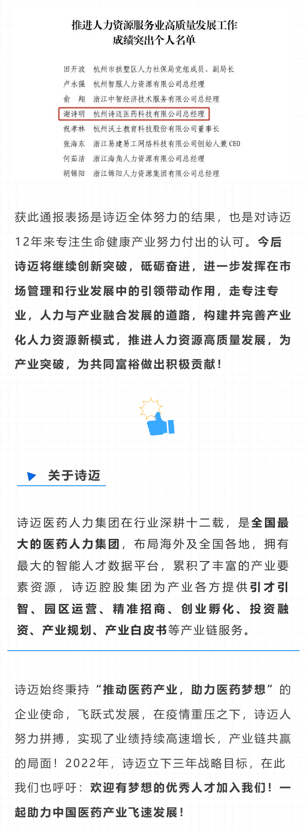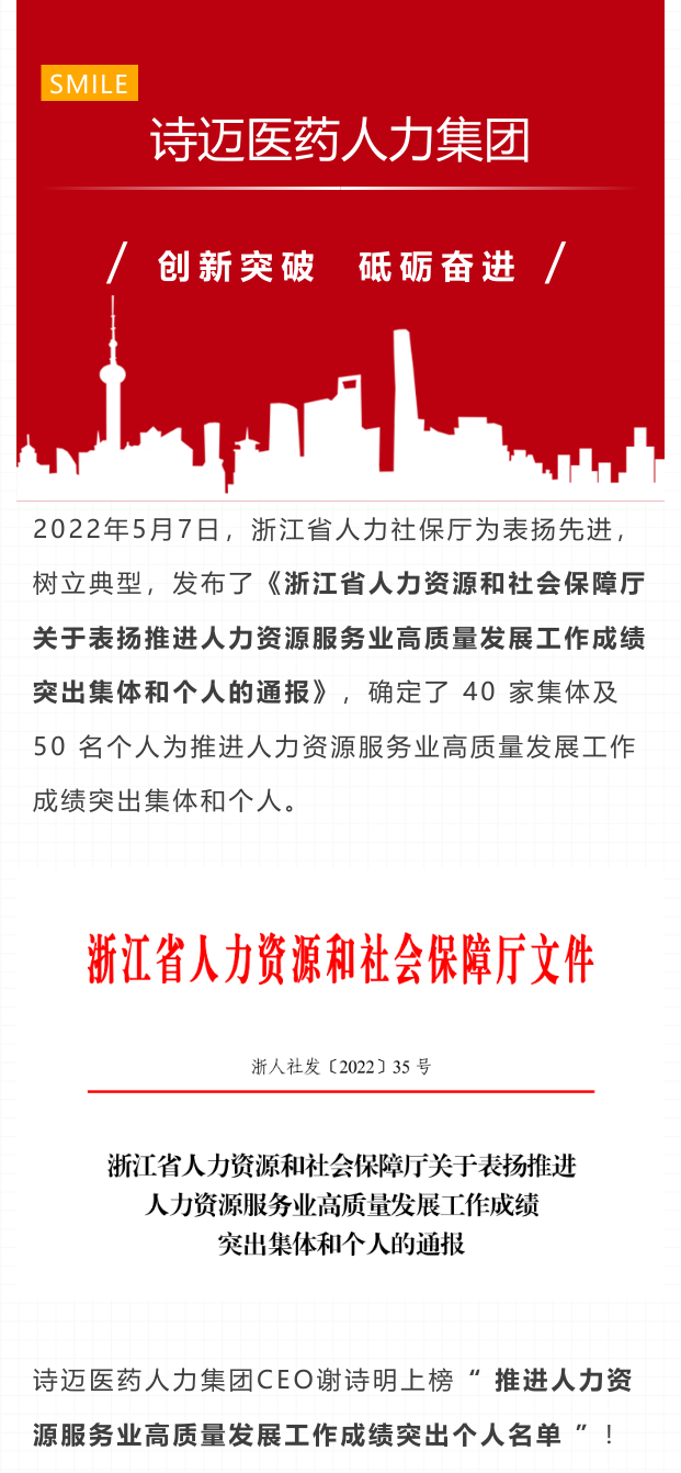 点赞!获浙江省人力社保厅通报表扬!-专业医药猎头-医药人才网杭州诗迈医药科技有限公司