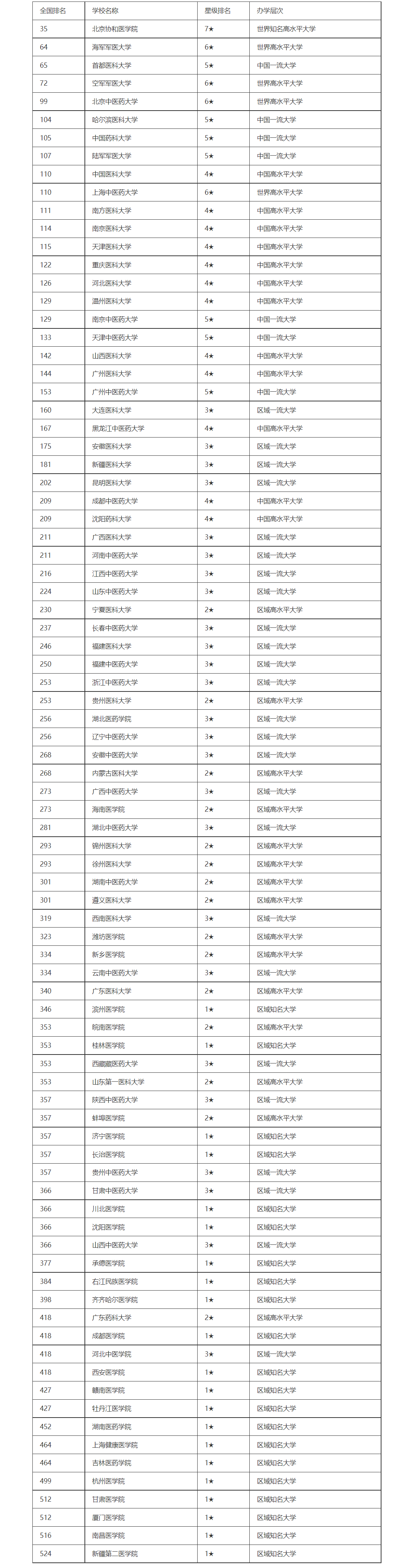 根据最新发布校友会2022中国大学排名榜单显示,北京协和医学院全国排名第35名,雄居校友会2022中国医药类大学排名第一。海军军医大学(第64名)居第2,首都医科大学(第65名)列第3。