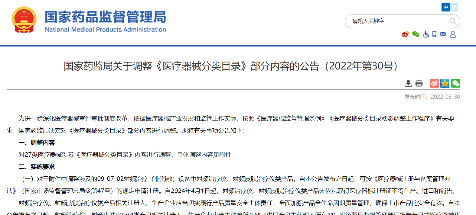 (一)对于附件中调整涉及的09-07-02射频治疗(非消融)设备中射频治疗仪、射频皮肤治疗仪类产品,自本公告发布之日起,可按《医疗器械注册与备案管理办法》(国家市场监督管理总局令第47号)的规定申请注册。自2024年4月1日起,射频治疗仪、射频皮肤治疗仪类产品未依法取得医疗器械注册证不得生产、进口和销售。