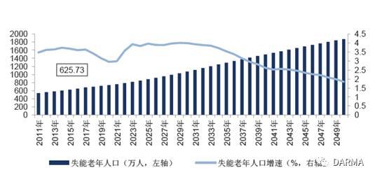 如图2,由于高龄老年群体中失能率在50%以上,我国失能老人规模或从现阶段的625万人上升到2050年的1875万人。