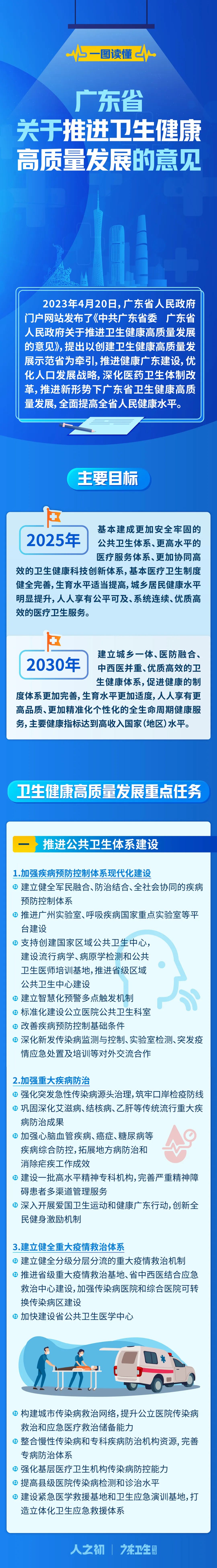 4月20日,《中共广东省委 广东省人民政府关于推进卫生健康高质量发展的意见》(下称《意见》)公开发布,共十个方面31条,涉及公共卫生体系、医疗服务体系、健康湾区、中医药传承创新发展、全生命周期卫生健康体系、医学科技创新和智能化数字化转型等诸多方面。