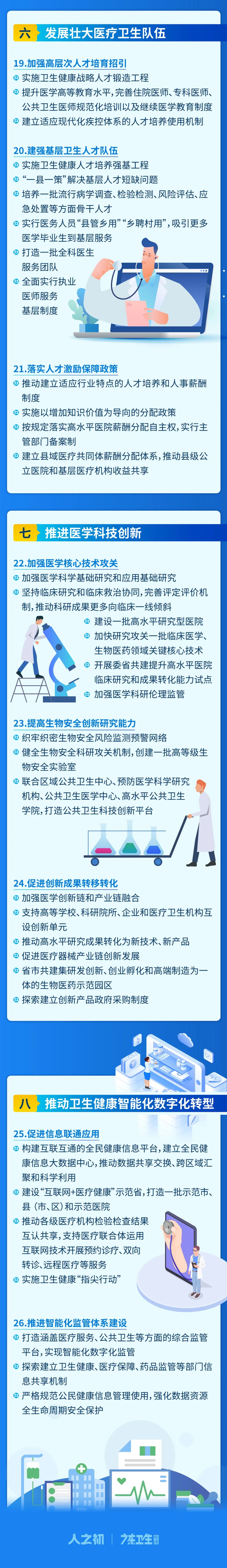 《意见》提出,到2025年,基本建成更加安全牢固的公共卫生体系、更高水平的医疗服务体系、更加协同高效的卫生健康科技创新体系,基本医疗卫生制度健全完善,生育水平适当提高,城乡居民健康水平明显提升,人人享有公平可及、系统连续、优质高效的医疗卫生服务。