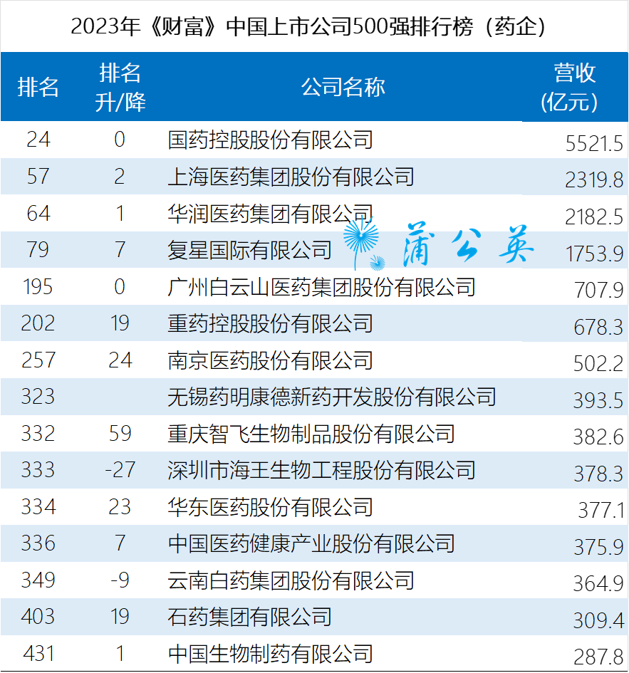 与2022年相比,排名位置不变的药企共2家,国药控股,排名24位,营收5521.5亿元。白云山医药集团,排名195位,营收707.9亿元。