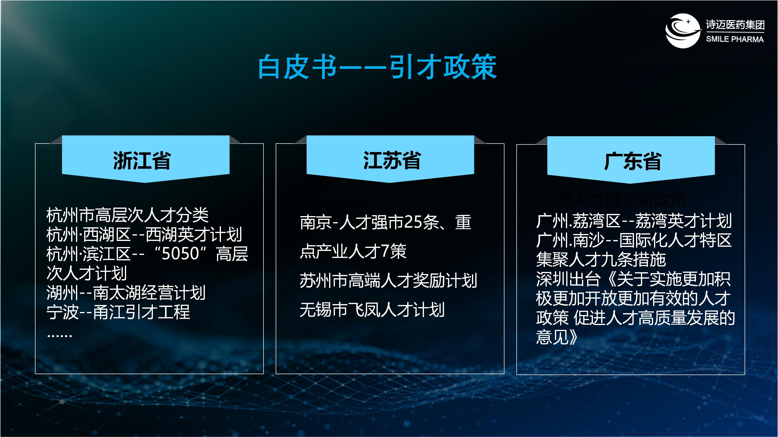 为深入了解中国医药人才特征和发展趋势,有效推动人才引领产业高质量发展,诗迈医药集团基于诗迈医药人才大数据和诗迈数智医药产业大数据,对生物医药产业政策、产业格局、人才结构、人才分布、人才需求、薪酬待遇、实操建议、未来展望、引才政策、产业发展策略等进行了深入分析研究,在2020版白皮书的基础上,联合企业、高校、科研机构、产业园等共同努力,编制完成《2023中国医药人才发展白皮书》,供医药行业创业者、管理者、投资者、HR、高校、政府部门、产业园、行业协会决策参考,共促产业发展。