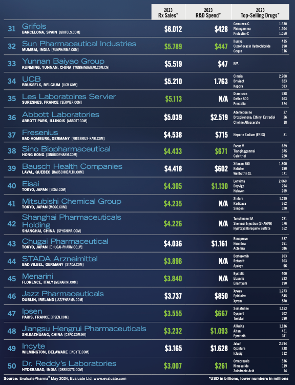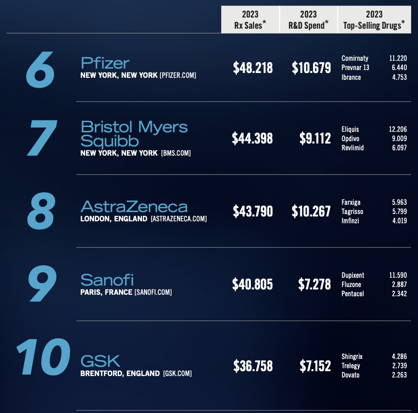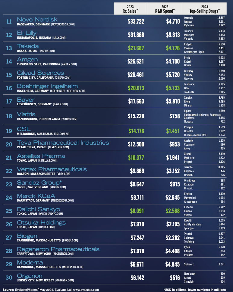 6月14日,美国制药经理人Pharm Exec发布了2024年全球制药企业TOP50榜单。