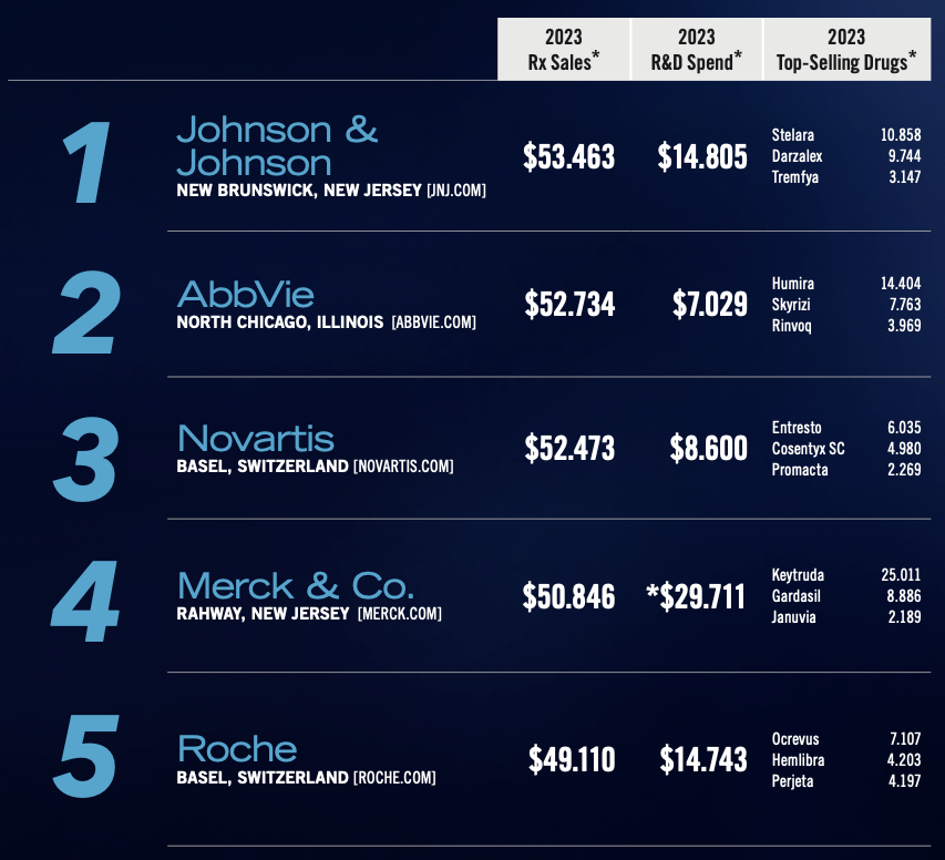 与此同时,强生公司凭借其"相当多元化的投资组合",在处方药销售额达到534.6亿美元后,超越辉瑞公司,荣登榜首。而AbbVie公司则以527.3亿美元的销售额再次位列第二,尽管其股价下跌了6.1%,这反映了美国市场引入Humira生物仿制药对其业绩的冲击。