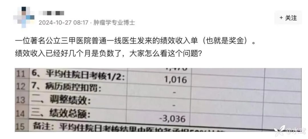 更有重庆某医院放射科主任在网上发文称:我们医院儿科基本废了,上月全科总绩效只有几千元,这让全科十多号人怎么分?还好,领导同意科主任找财务科预支了部分工资,好让大家维持生计。