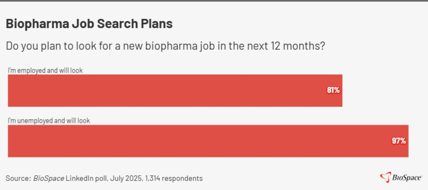 根据 BioSpace 近期在领英上的一项求职意向调查显示,大多数有工作的生物技术和制药行业从业者都希望在不久后换一份工作。