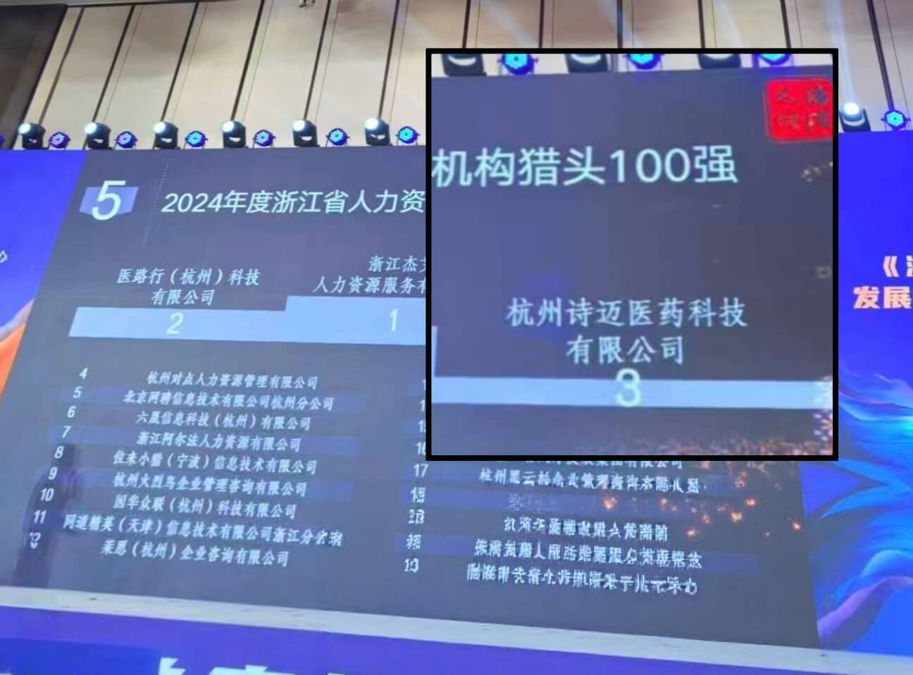 此次活动正式揭晓了2024 年度浙江省人力资源服务猎头机构猎头100强榜单,诗迈医药集团凭借在医药领域的专业深耕与服务创新,连续稳居前三甲。彰显行业稳定领先地位。作为国家高新技术企业与浙江省专精特新企业,诗迈医药集团的核心竞争力源于 “科技 + 专业” 的双重赋能。依托自主研发的鳌领人力系统、医药之梯人才网以及全国首个生命健康产业人才大数据平台Biotsmile,构建了高效的人才匹配体系,精准覆盖创新药研发、临床医疗、医疗器械等多领域的中高端岗位招聘,服务全球知名企业客户。