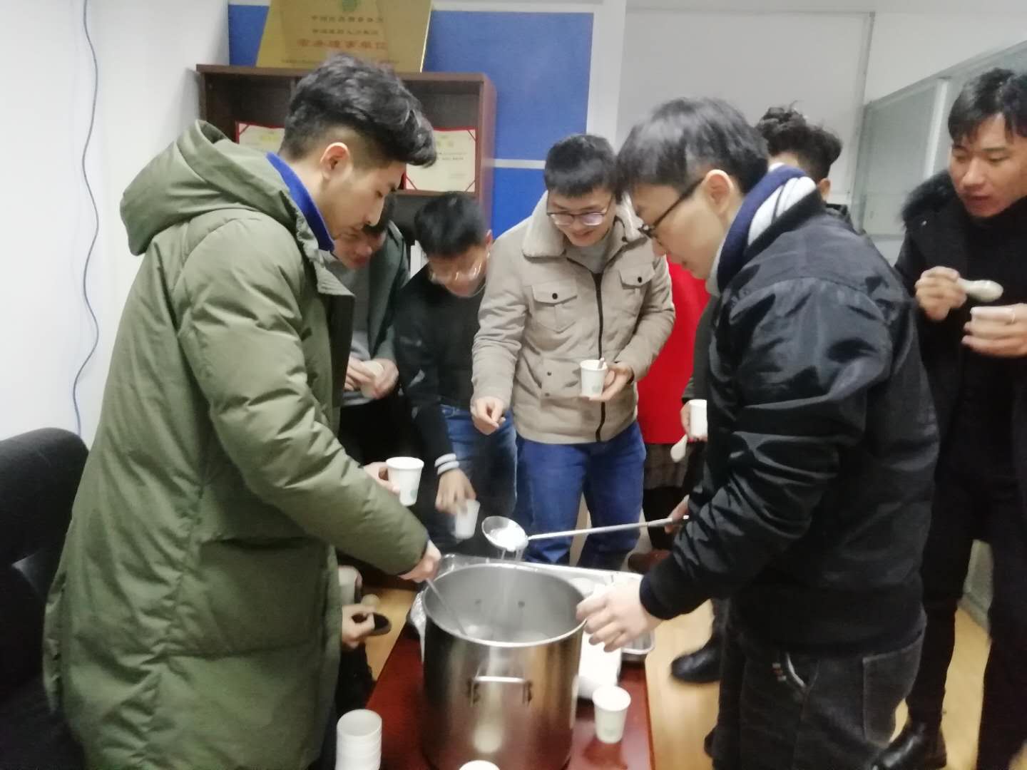 团团圆圆庆元宵,将思念揉成面,快乐做成馅,加一点甜蜜水,点一束真心火,慢慢熬成幸福美满汤圆送给最亲的亲人和伙伴。下午3点多,公司就开始煮汤圆,在所有员工的期望中,元宵一颗颗浮上水面,软软糯糯,煞是可爱。员工们争先恐后的排好队领取元宵,八颗一碗,祝大家新的一年发发发。有些爱吃的,贪吃的员工一碗接着一碗的讨要。小小的元宵为公司增添更多节日气氛。