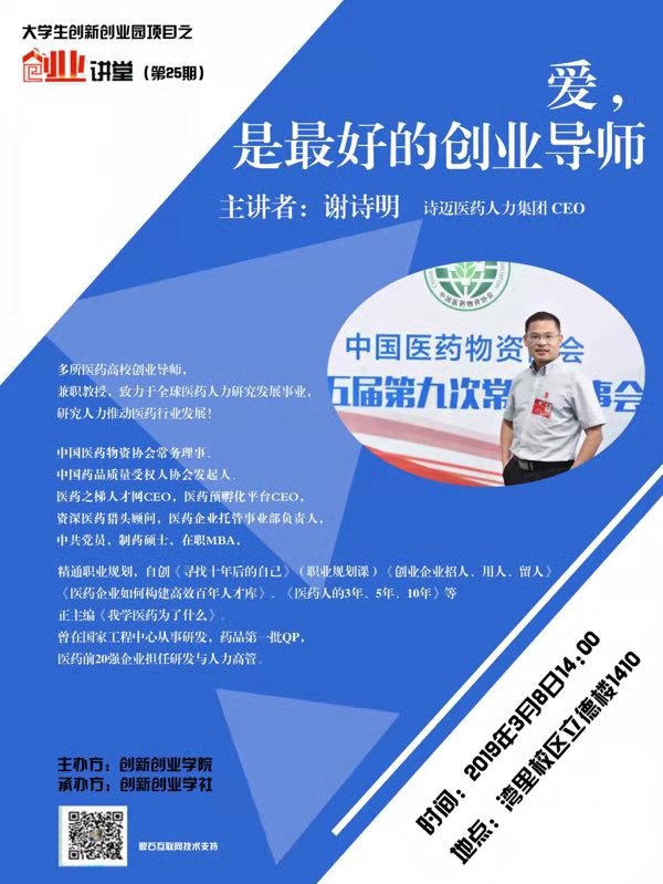 为积极弘扬大学生创业,进一步树立大学生就业观,全面提升大学生创新创业价值观。3月8日,诗迈人力集团CEO谢诗明出席江西中医药大学创新创业讲堂,并进行《爱,是最好的创业导师》创新创业指导演讲,到场学子300余人。