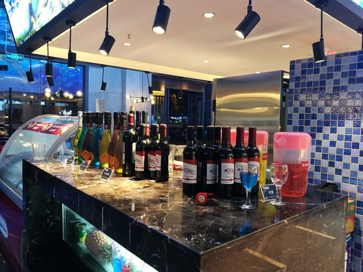 环境优美的餐厅,淡蓝色的格调让人仿佛置身海洋,各种海鲜、烤肉、小吃、甜点罗列其中,任君挑选。