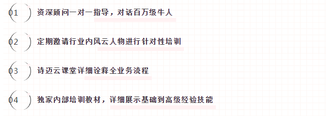 顾问助理AC→猎头顾问C→团队负责人→分公司负责人最快两年即可晋升分公司负责人例:2017年7月毕业,2018年12月升任分公司负责人,2019年收入150万完善的培训体系
